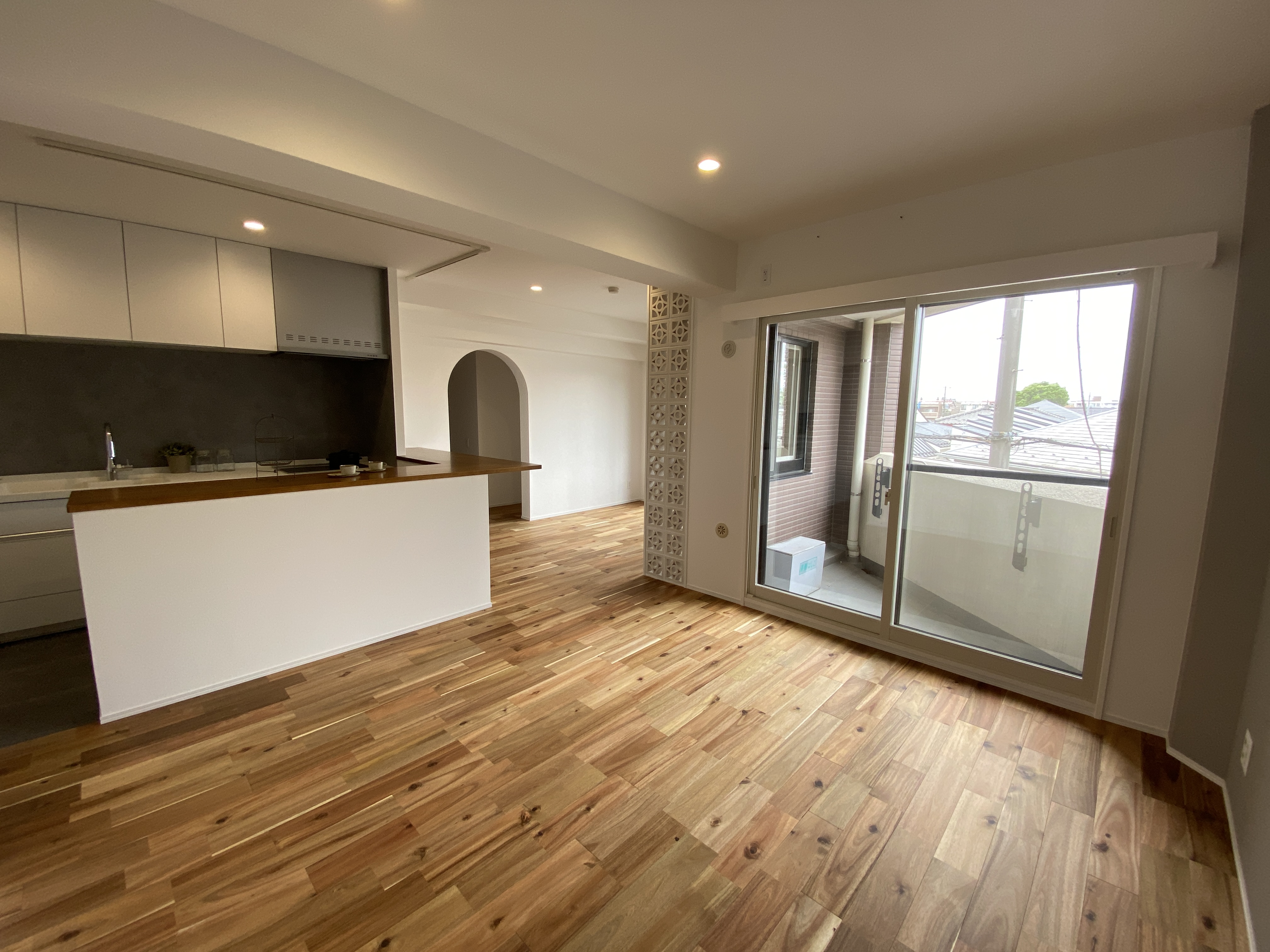 沖縄 花ブロック リフォーム リノベーション 無垢フローリング アーチ開口 スタディー